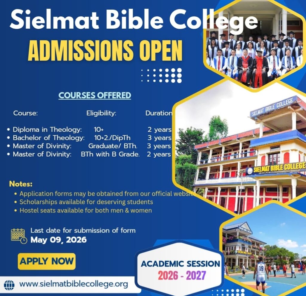 Admissions for the 2026–2027 academic year are now open for the following programs: Diploma in Theology (2 years, Class X qualification), Bachelor of Theology (3 years, Class XII or Dip.Th. qualification), and Master of Divinity (2–3 years, Graduate or B.Th. qualification) — contact Sielmat Bible College, Sielmat, Churachandpur, Manipur for more information.